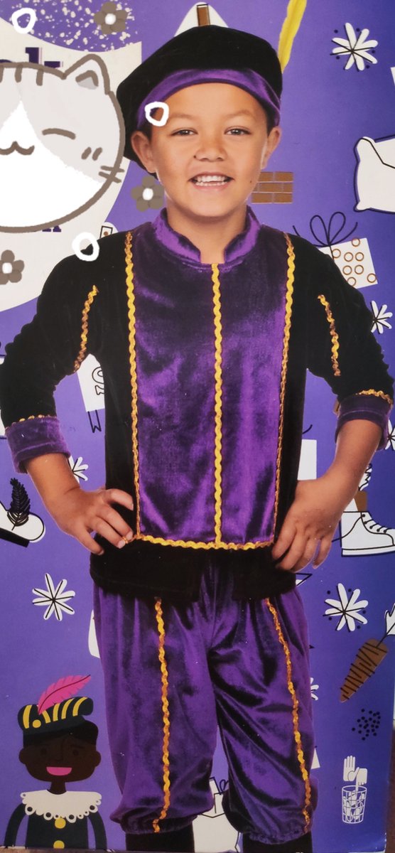 Pieten kostuum Pedro 4-delig voor kinderen in de kleur paars. Dit Pietenpak bestaat uit de broek, het shirt, de kraag en de baret. De Pieten accessoires zijn ook los verkrijgbaar bij ons. Maak iedere intocht, Sinterklaasviering of pakjesavond onvergetelijk voor de kinderen met dit traditionele Pietenpak! Sinterklaas verkleedkleding voor volwassenen.