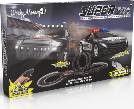 Geschikt voor kinderen vanaf 4 jaarDe set bevat: een racebaan en 2 auto'sAfmetingen verpakking: 55,7 x 46,5 x 6,7 cmAfmetingen van de verdeelde baan: 70 x 174 cmFabrikantcode: 91006