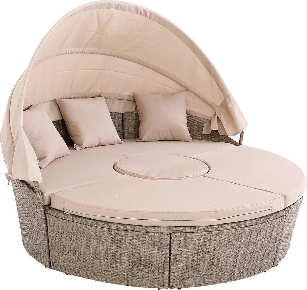 Outdoor lounge om u goed te voelen Met een diameter van 185 cm biedt het CASARIA® zonne-eiland voldoende ruimte voor ontspannende uren in de buitenlucht. De lounge heeft een hoogwaardige afwerking en is gemaakt van weerbestendig, onderhoudsvriendelijk polyrattan. Een telescopische tafel met een diameter van 58 cm vormt het middelpunt van de zithoek. De tafel kan naar boven worden uitgeschoven en binnenin is er praktische opbergruimte, bijvoorbeeld voor drankjes. Het opbergoppervlak kan ook als dienblad worden gebruikt.