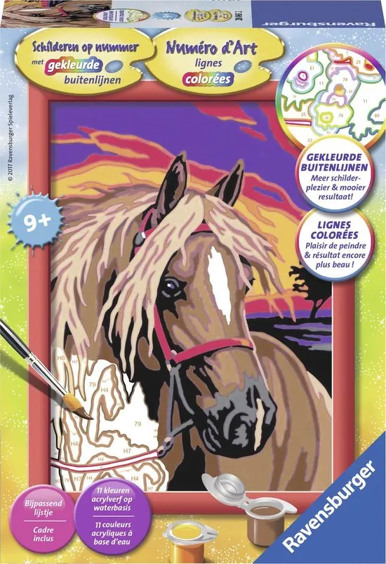 Schilderen op nummer van Ravensburger - iedereen kan schilderen! Dankzij de gekleurde buitenlijnen kunnen kinderen de afbeelding van de springende dolfijnenen de benodigde kleuren sneller herkennen. Zo is het kinderlijk eenvoudig de kunstenaar in jezelf wakker te maken! Met grote schilderoppervlakken en veel verschillende kleuren zijn de schilderplaten van de schilderen op nummer Classic-serie van Ravensburger zeer geschikt voor de jonge kunstenaar. Uitpakken en aan de slag! Onze acrylverf:• droogt snel • is op waterbasis• ruikt niet onaangenaam• maakt penseelreiniger overbodig Inhoud: 10 kleuren acrylverf in hersluitbare potjes penseel voorbeeldblad 1 schilderpaneel 1 lijstje