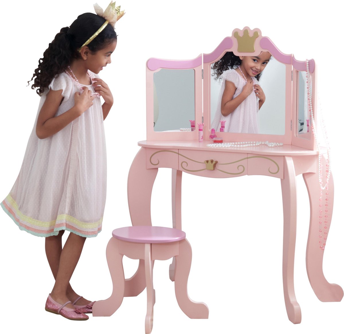 Een mooie en elegante stevige opmaaktafel visagie make up kaptafel in de kleur roze met een klassieke uitstraling gecombineerd met een strakke afwerking en daardoor geschikt voor elke meisje slaapkamer of andere ruimte in uw huis. Deze kinder kaptafel is een gegarandeerd succes bij je kleine prinses en kan voor verschillende doeleinden worden gebruikt o.a. voor het spelen als kapsalon, visagiste of nagelstyliste maar ook natuurlijk ook geschikt om aan te knutselen of als bureau. Om ze op weg te helpen hebben we de leuke accessoires toegevoegd aan onze kaptafel, een borstel en een sierraden tasje.Dit roze tafeltje met spiegels heeft een lade om de make-up, accessoires en sieraden in op te bergen. De twee extra zijspiegels kunnen naar wens worden gedraaid en de bijpassende houten roze kruk met extra opbergruimte onder de zitting maakt deze tafel compleet.