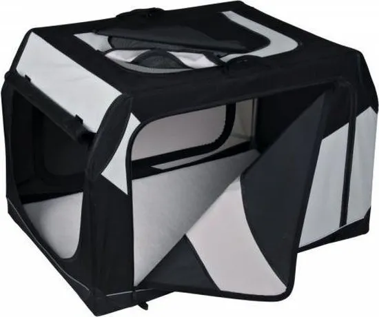 Trixie Reismand Grijs 95x70x75 cm Met deze Trixie Reismand heeft jouw hond of kat op elke show of bij visite een eigen bench! Deze handige mobiele bench van Trixie is gemaakt van polyester. Daardoor is de reismand lichtgewicht, snel op te zetten en eenvoudig op te vouwen. De bench komt met een handige transporttas, zodat je de reismand gemakkelijk mee kunt nemen naar elke gewenste bestemming. Ideaal voor shows, op reis of op visite. Met de lussen aan de onderkant en bijgeleverde haringen kun je de bench gemakkelijk overal stevig vastzetten, zodat je er ook buiten gebruik van kunt maken. Ook voor je dier is de bench comfortabel; de bodemplaat is bekleed met fleece en rondom de bench zijn gaasstukjes ingezet, voor goede ventilatie. Bovendien is de deur volledig uitritsbaar voor makkelijke toegang tot je dier en is de bench eenvoudig schoon te maken. Een fijn plekje voor ieder dier waar je ook heen gaat dus! - Gemaakt van polyester, dus lichtgewicht en makkelijk te vervoeren en schoon te maken - Met transporttas om de bench makkelijk mee te nemen - Met drie zijvakken voor het opbergen van spullen - Met lussen en haringen voor stevige plaatsing - Met gaas-inzetstukjes voor ventilatie, die je ook af kunt dekken indien gewenst Afmetingen: 95x70x75 cm