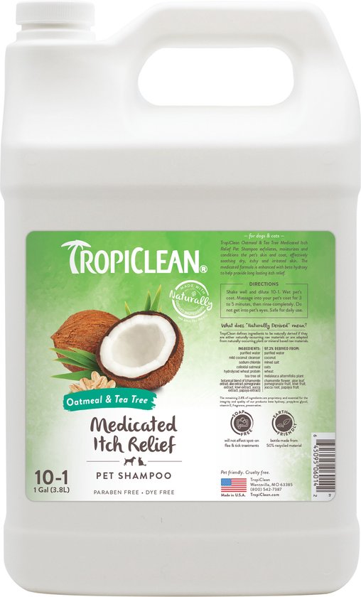 | Verpakkingsinhoud: | Bevat één (1) fles TropiClean Gentle Coconut Hypoallergenic Puppy & Kitten Shampoo van 3.8L. Verdun 16-1. |