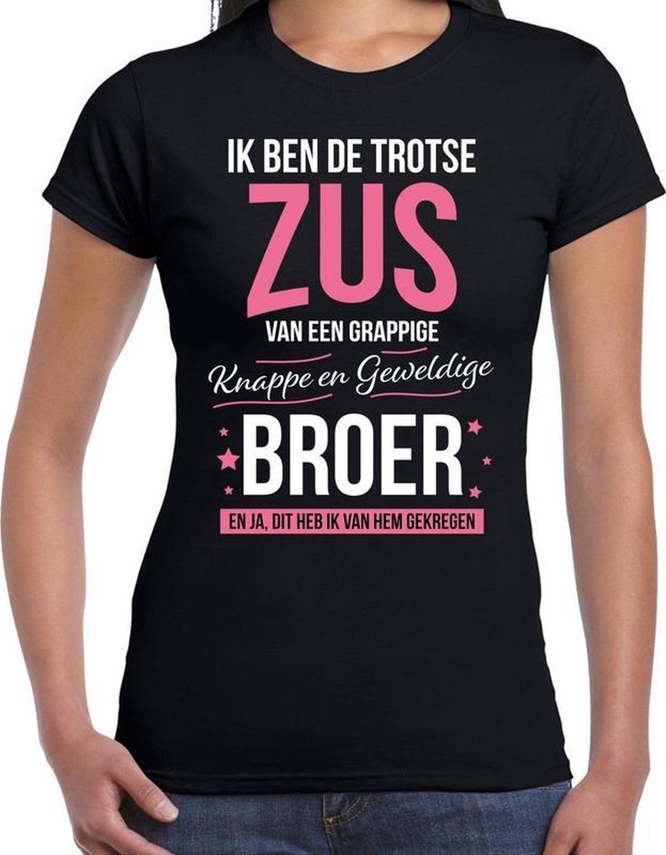 Trotse zus / broer cadeau t-shirt zwart voor dames. Op dit zwarte shirt staat in roze en witte letters de tekst: Ik ben de trotse zus van een prachtige grappige knappe en geweldige broer. En ja, dit heb ik van hem gekregen.