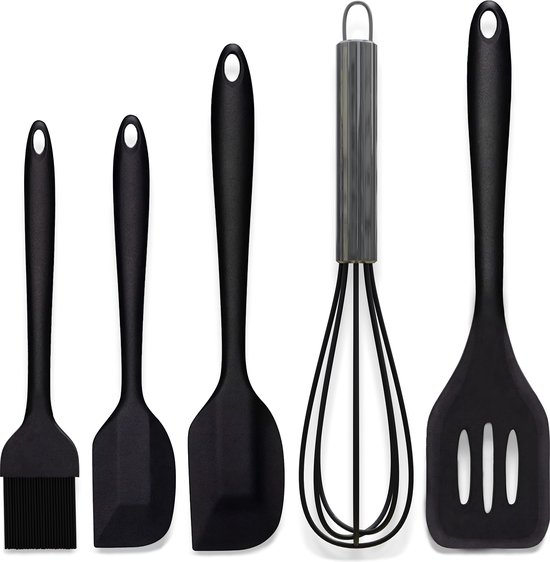 HI NATURE™ Spatel set van 5 stuks - Siliconen spatel set BPA vrij - Spatelset - keukengerei set - Keukenspatel | Hittebestendig - Vaatwasserbestendig | Bakspaan - Bakkwast - Garde - Pannenlikker | Anti-aanbak spatelset - keuken gerei (Zwart)