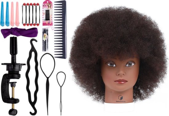 Desire of Goods Afro oefenhoofd kappershoofd - Donkerbruin haar - met anti klit haarborstel - Echt haar - tafelklem - 30 cm