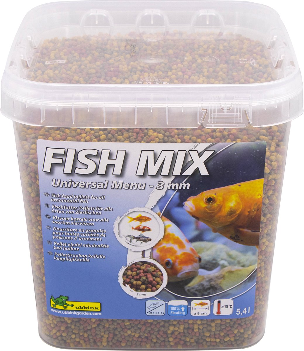 Ubbink Fish Mix® - Universal Menu is een mix van drie complete soorten visvoer van drijvende pellets van 3 mm (voor vissen van 8 cm tot 20 cm) of 6 mm (voor vissen van 20 cm of meer) in de kleuren rood, geel en groen met voedingsstoffen, vitaminen, sporenelementen en astaxanthine. Ideaal voor het voeren van onder andere shubunkins, kroeskarpers, sarasas, etc. Dit voer is gearomatiseerd met insectenmeel, wat ons eraan herinnert dat sommige vissen hun voer vinden in vliegen of muggen op het wateroppervlak.- Analytische bestanddelen: ruw eiwit 31%; vet 5%; ruwe celstof 3,1%; ruwe as 9,1%, fosfor 1,2%, calcium 1,1%; natrium 0,1%.- Inhoud: 5,4 l / 1760 g – 6 mm