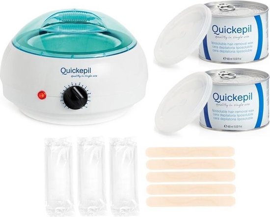 Compleet startset voor Wax/hars verwarmer 800ML - 1000ML, 175W Inhoud van de set:- 175W elektrische harsverwarmer - 1x 800ml hars in blik (De kleur van de wax die u ontvangt, wordt bij uw pakket gevoegd op basis van onze voorraad. Deze kan dus anders zijn op de afbeelding)- 20 stuks ontharing strips- 5 houten spatels Harsverwarmer voor het verwarmen van ontharingshars in blik. Geschikt voor hars/wax blikjes met een inhoud van 800ml en 1000ml. Ook geschikt voor losse hars parels.De verwarmer is veilig en eenvoudig in gebruik met een korte opwarm tijd. Perfect voor thuis gebruik.Inhoud:Elektrische harsverwarmer.Uitneembaar, metalen container12 maanden garantieTechnische gegevens: - 220/240 Volt / 50Hz - Vermogen: 175 WOntharingshars in blik:De QUICKEPIL hars in blik is speciaal gemaakt voor eenvoudig thuis gebruik met goede resultaten. Door haar speciale samenstelling koelt de hars langzaam af, geeft een goede hechting aan de haren en is eenvoudig te verwijderen met de bijgeleverde strips. Een universele hars op basis van bijenwas welke geschikt is voor elk huidtype.Capaciteit: 800 mlVezelvlies strips:Vezelvlies strips geven een veel betere hechting aan de hars dan katoenen strips, waardoor de hars gelijkmatiger verwijdert kan worden.De strips hebben een afmeting van: 7cm x 20cm en zijn per 20 stuks verpakt.Houten spatels:Ideaal voor het egaal aanbrengen van de hars op de huid.15cm x 1,8cm x 0,16cm