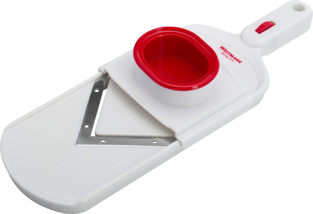 Met deze snijhulp worden fruit en groenten ook voor kinderen een echte blikvanger! Dankzij de vier hulpstukken voor het snijden van blokjes, staafjes of stukjes, een schaaf, een julienne- en spiraalsnijder alsmede verschillende toebehoren kunt u uw fruit en groente voortaan zeer veelzijdig en afwisselend bereiden en presenteren.Belangrijkste kenmerken• Snijhulp voor het snel en eenvoudig versnipperen van uien of het hakken van groente en fruit, met opvangcontainer en passend deksel voor hygiënisch bewaren van de gesneden levensmiddelen, incl. 4 opzetstukken met 7 verschillende snijmogelijkheden• Moeiteloos, snel en stil hakken van fruit en groente in gelijkmatige blokjes, staafjes of spiraaltjes met behulp van scherpe RVS inzetstukken, geslepen messenaggregaten voor preciese sneden zonder beschadiging• Veilig snijden zonder gevaar: Eenvoudige verwerking door het naar beneden drukken van de bovenste klep, 4 anti-slip rubber voeten voor veilige grip op alle oppervlakken, vingerbescherming/resthouder voor toepassing met de schaaf• Eenvoudig reinigen van de kunststofdelen, vaatwasmachinebestendig, kunststoffen reinigingsvork voor het verwijderen van restjes en het schoonmaken van het messenaggregaat• Inhoud: 1 x Westmark multisnijder, Dicer Star Plus in verpakking, 12-delig, afmetingen: 31,5 x 11, 5 x 14, 5 cm, materiaal: RVS/kunststof, kleur: Wit/transparant/rood, 97112260