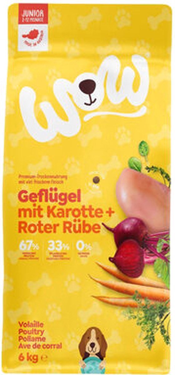 WOW Senior Graanvrij Eend met Munt en Rode Biet 6 kg Premium graanvrij droogvoer met een hoog gehalte aan vers vlees en verfijnd met waardevolle ingrediënten zoals lijnzaad, kruiden en hoogwaardige oliën. Geproduceerd in Oostenrijk met bij voorkeur regionale grondstoffen. Samenstelling: eend 38% (verse eend 23%,eenden-eiwit gedroogd 15%), aardappels 32%, zoete aardappels 8%, erwten, vet van gevogelte, bietenpulp (ontsuikerd), spinazie 0,8%,rode bieten 0,6%, lijnzaad, zalmolie, kruiden, pepermunt 0,1%, wortels, veenbessen 0,1%, groenlipmossel, yucca schidigera, mineralen, FOS 0,1%, MOS 0,1%. Onze grondstoffenAlle WOW-producten worden 100% behoedzaam en zorgvuldig in Oostenrijkgeproduceerd volgens het recept van de natuur - duurzaam en regionaal. VleesDe premium menu‘s van WOW bestaan uit hoogwaardig spiervlees dat het organisme van dehond voorziet van essentiële eiwitten en omega-6-vetzuren. Bovendien bevatten dezemenu‘s ook geselecteerd orgaanvlees, zoals hart of lever. Groenten, fruit en kruidenOnze fijne selectie van groenten en fruit voorziet de hond van vezels en stimuleert de motoriek van de darmen. Geselecteerde kruiden ronden de menu‘s voor compleetvoer op natuurlijke wijze af.OliënDe fijnste oliën, zoals lijnzaadolie in het natvoer en zalmolie in het droogvoer, zorgen voor eenuitgebalanceerde verhouding van omega-3- en omega-6-vetzuren.Zeewier en eierschaalpoederHoogwaardige additieven zoals zeewier en eierschaalpoeder voorzien de hond op natuurlijkemanier van essentiële vitaminen, sporenelementen, essentiële aminozuren en mineralen.Natuurlijk zonder granenOm onze WOW-menu‘s licht verteerbaar te maken, zelfs voor honden met gevoelige magen ofdarmen, gebruiken wij helemaal geen granen.