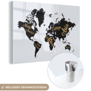 MuchoWow® Glasschilderij - Wereldkaart - Letters - Goud - 150x100 cm - Acrylglas Schilderijen - Foto op Glas