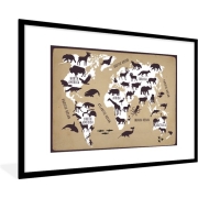 Fotolijst incl. Poster - Wereldkaart - Dieren - Bruin - 90x60 cm - Posterlijst