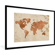 Fotolijst incl. Poster - Wereldkaart - Papyrus - Koper - 90x60 cm - Posterlijst