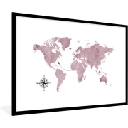 Fotolijst incl. Poster - Wereldkaart - Roze - Windroos - 90x60 cm - Posterlijst