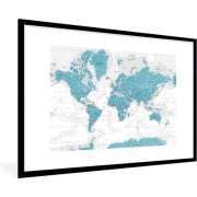 Fotolijst incl. Poster - Wereldkaart - Blauw - Topografie - 90x60 cm - Posterlijst