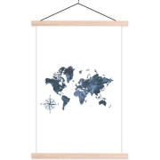 Posterhanger incl. Poster - Schoolplaat - Wereldkaarten - Waterverf - Blauw - 120x180 cm - Blanke latten