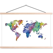 Posterhanger incl. Poster - Schoolplaat - Wereldkaart - Waterverf - Regenboog - 150x100 cm - Blanke latten