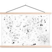 Posterhanger incl. Poster - Schoolplaat - Wereldkaart - Kinderen - Wit - Zwart - 150x100 cm - Blanke latten