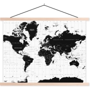 Posterhanger incl. Poster - Schoolplaat - Wereldkaart - Zwart - Wit - Atlas - Aarde - Educatief - 150x113 cm - Zwarte latten