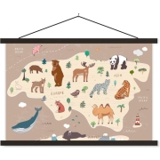 Posterhanger incl. Poster - Schoolplaat - Wereldkaart - Bruin - Dieren - Kids - Jongens - Meisjes - 150x100 cm - Zwarte latten
