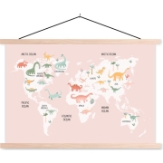 Schoolplaat - Wereldkaart Kinderen - Dino's - Roze - Posterhanger - Textielposter - 150x100 cm