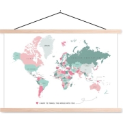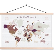 Posterhanger incl. Poster - Schoolplaat - Wereldkaart - Roze - Olieverf - 150x100 cm - Blanke latten