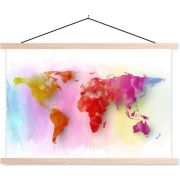 Posterhanger incl. Poster - Schoolplaat - Wereldkaart - Waterverf - Kleuren - 120x120 cm - Blanke latten