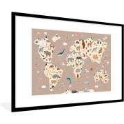 Poster in fotolijst kinderen - Slaapkamer decoratie - Wereldkaart kinderen - Dieren - Bruin - Jongens - Meisjes - Decoratie kinderkamers - 90x60 cm - Poster kinderkamer