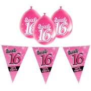 Sweet 16 - Sixteen versiering pakket - vlaggetjes - ballonnen - roze - met leeftijd print -