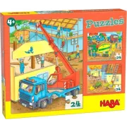 3 Puzzels van het merk Haba met daarop verschillende afbeeldingen van een bouwplaats. De puzzels bestaan uit 24 puzzelstukjes.…