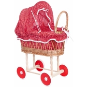 Rieten poppenwagen.Met zijn leuke rood met witte stippen bekleding oogt deze rieten poppenwagen héél chique. Ideaal om met teddybeer of pop op wandel te gaan! Afm. 50x28x58 cm. 3…
