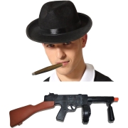 Gangster/maffia of Roaring Twenties carnaval verkleed set, bestaande uit een gleufhoed in de kleur zwart samen met een machinegeweer van 50 cm en een dikke vette nep sigaar. Zo ben je net Al…