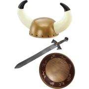Carnaval verkleed set helm, zwaard en schild. Set bestaande uit een kunststof Viking/ridder gouden helm met witte hoorntjes, een zwaard en een rond schild. Afmeting zwaard: ca. 58 cm. Afmeting…