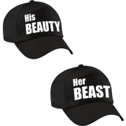 Her Beast en His beauty grappige verkleed petten / caps in het zwart met witte letters voor volwassenen. Deze zwarte caps zijn bedrukt met de tekst: her beast / his beauty. Hartstikke leuk cadeau…