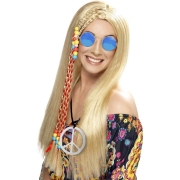 Dames Flower Power Hippie Sixties verkleed set pruik, een peace teken ketting en een ronde blauwe glazen bril. Lange blonde Sixties pruik met vlechtjes en kralen, geschikt voor dames. Deze blonde…