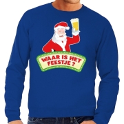 Foute kersttrui / sweatshirt blauw, Waar is het Feestje, voor heren. Deze grappige sweater voor Kerstmis heeft een print van een dronken Kerstman met de tekst: Waar is het Feestje? Deze kersttrui…