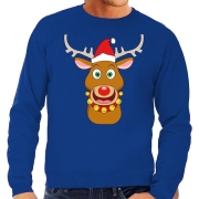 Foute kersttrui rendier Rudolf met rode kerstmuts blauw voor heren. De sweater is bedrukt met een afbeelding van een blije Rudolf het rendier met een rode kerstmuts. Deze kersttrui/ sweater/…