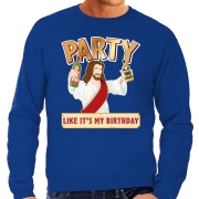 Foute Kersttrui Party Jezus blauw voor heren. Deze Kerst trui / sweater is bedrukt met de afbeelding van een feestende Jezus en de tekst: Party like it's my birthday. Deze kersttrui / sweater /…