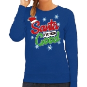 Foute kersttrui / sweater Santa I have been good blauw voor dames. De Kerst sweater is bedrukt met de tekst: Santa I've been good. Deze kersttrui / sweater / sweatshirt is van dun ongeborsteld…