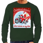 Foute christmas dreams groen voor heren. Deze Kerst trui / sweater is bedrukt met de afbeelding van de kerstman op een motor en de tekst: Hot Chicks on my bike. Deze kersttrui / sweater /…
