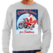 Foute driving home for christmas grijs voor heren. Deze Kerst trui / sweater is bedrukt met de afbeelding van de kerstman op een motor en de tekst: Driving home for Christmas. Deze kersttrui /…