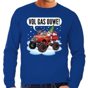 Foute Kersttrui monstertruck santa blauw voor heren. Deze Kerst trui / sweater is bedrukt met de afbeelding van de kerstman op een monster truck en de tekst: Vol gas ouwe! Deze kersttrui / sweater…