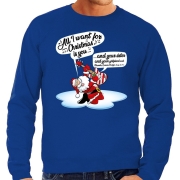 Grote maten foute Kersttrui zingende kerstman met gitaar blauw voor heren. Deze blauwe Kerst trui / sweater is bedrukt met de tekst: All I want for Christmas is you and your sister and your…