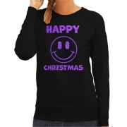 Foute kersttrui/sweater voor dames - Happy Christmas - zwart - glitter paars - Smile Emoticon S -