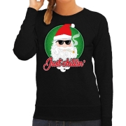 Foute Kersttrui just chillin zwart voor dames. Deze Kerst trui / sweater is bedrukt met afbeelding van een coole kerstman met joint en de tekst: Just Chillin'. Deze kersttrui / sweater /…