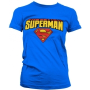 Superman T-shirt dames. Blauw girly fit T-shirt met de tekst Superman en het S logo. Het shirt is gemaakt van 100% gekamd katoen.…