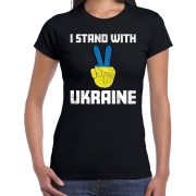 I stand with Ukraine t-shirt zwart dames - Oekraine shirt met Oekraiense vlag in vingers M -