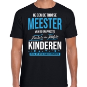Trotse meester cadeau t-shirt zwart voor heren. Op dit zwarte shirt staat in blauwe en witte letters groot de tekst: Ik ben de trotse meester van de grappigste leukste en liefste kinderen. En ja,…