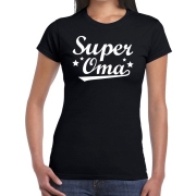 Super oma kado t-shirt zwart dames. Op dit zwarte shirt staat in witte sierlijke letters de tekst: Super oma. Leuk om cadeau te geven voor oma's verjaardag of gewoon zomaar. Materiaal: 150…