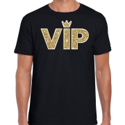 VIP goud glitter and glamour tekst t-shirt zwart voor heren. Op dit zwarte glamour shirt staat groot de tekst VIP in gouden bling bling bedrukking, met een kroontje op de letter i. Dit VIP…